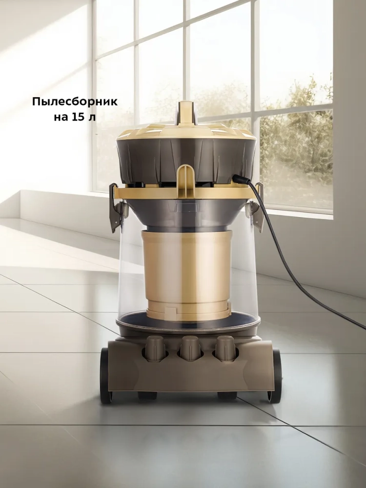 Пылесборник емкостью 15 литров подходит для генеральной уборки и уборки после ремонта. Он выполнен из прозрачного пластика, поэтому вы поймете, когда его следует очистить. Пылесборник с блоком фильтров легко очищаются и моются, что значительно облегчает уход за устройством.