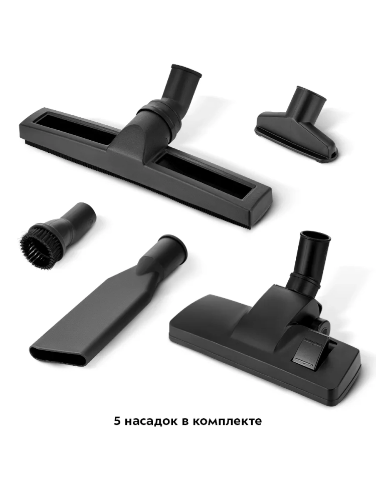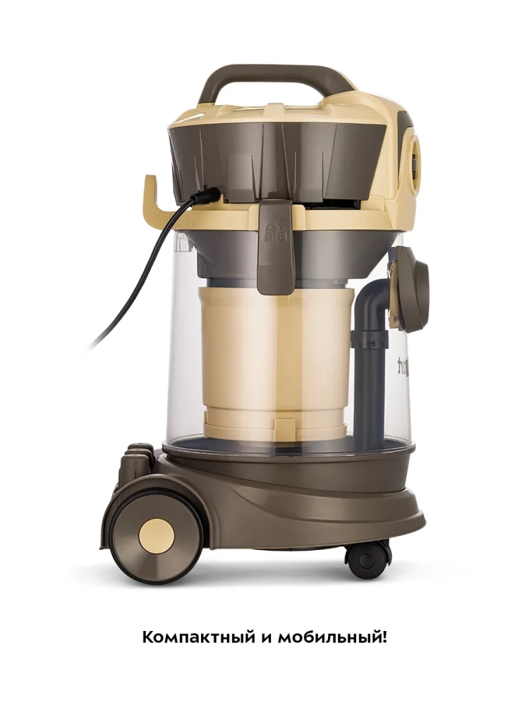 Устройство оснащено колесами для легкого перемещения во время уборки и ручкой для переноски. Специальные держатели на корпусе и удлинительной трубке позволяют компактно и удобно хранить все аксессуары. Также на корпусе есть держатель для смотки шнура.