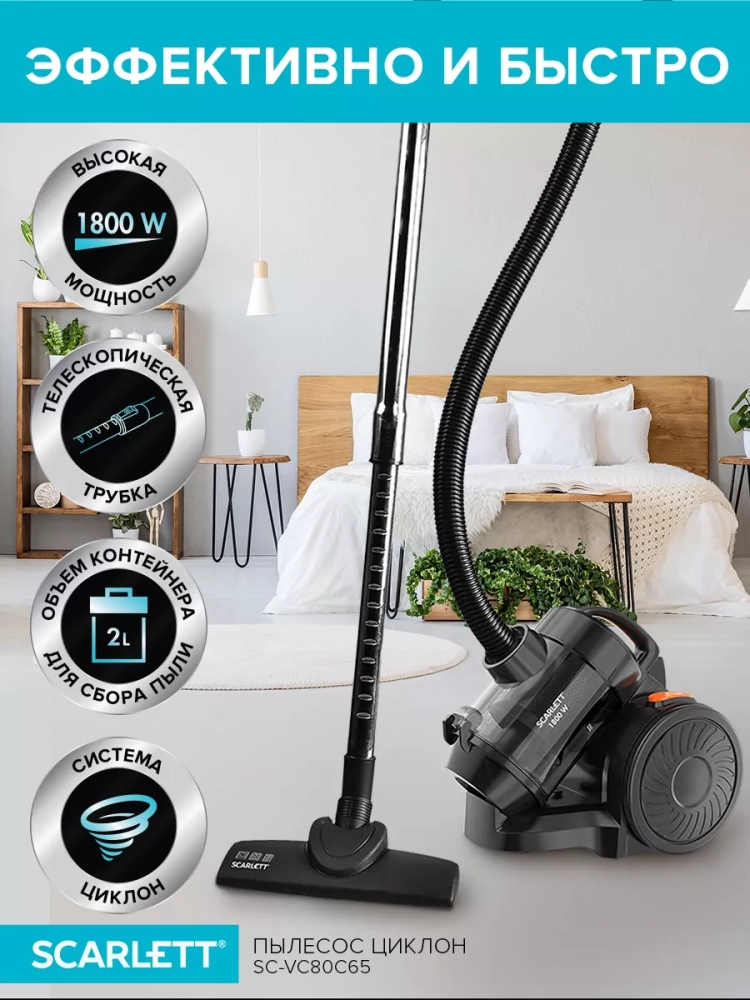Пылесос SC-VC80C65 - доступное и надежное решение для вашей уборки. С его высокой мощностью 1800 Вт и использованием технологии циклона, этот пылесос обеспечивает качественную уборку без потери мощности. Контейнер для сбора пыли вмещает до 2 литров и легко очищается и промывается водой, что позволяет избежать замены расходных материалов.