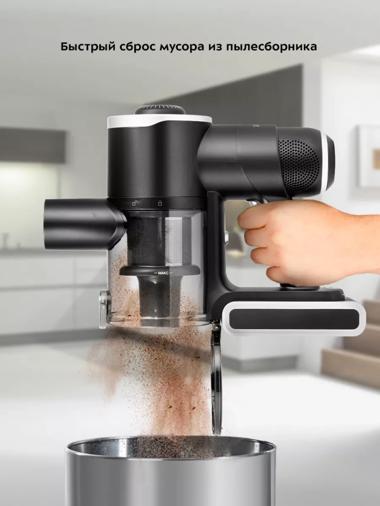 Конструкция 2 в 1 предусматривает наличие ручного пылесоса, который удобно использовать отдельно. Ручным пылесосом можно пропылесосить углы и плинтусы, обивку мебели, пыль со шкафов (куда обычным пылесосом очень трудно дотянуться из-за ограниченной длины шланга), шкафчики на кухне или в гостиной, книжные полки, коврики в автомобиле или багажник.