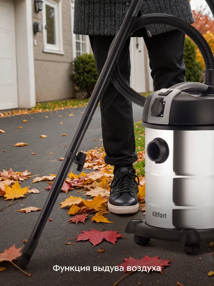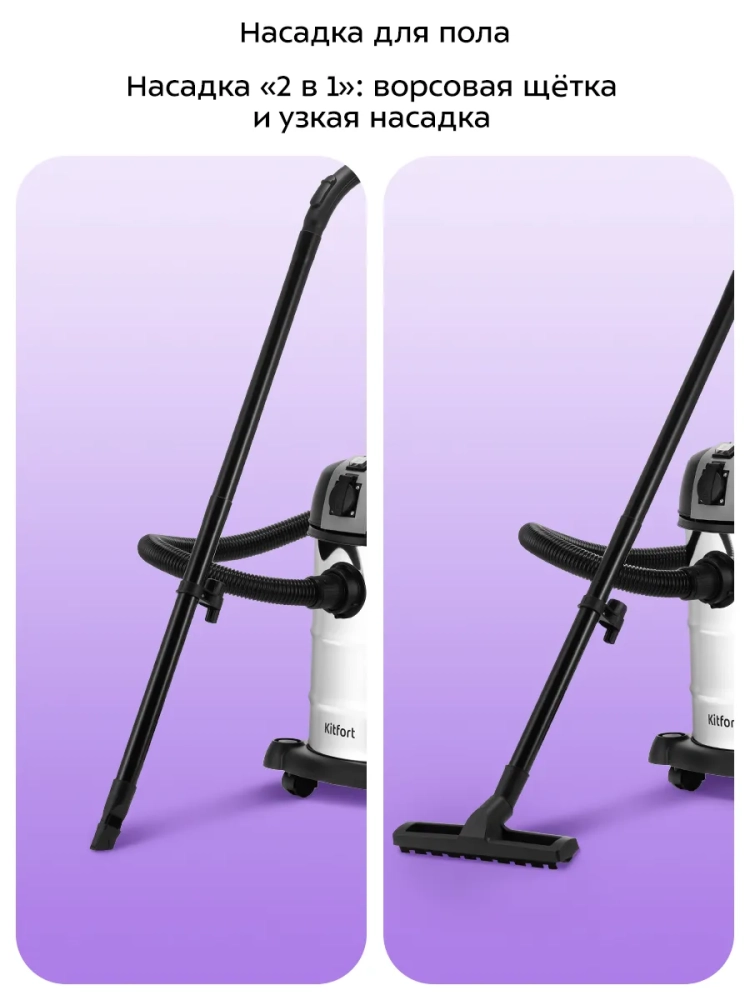 В комплекте с пылесосом идут насадки для пола и универсальная насадка «2 в 1», которая сочетает в себе узкую насадку и ворсовую щетку. Это позволяет добраться до самых труднодоступных мест и бережно очищать поверхности, не повреждая их. Пылесос Kitfort также может работать в режиме выдува, что удобно для очистки вентиляционных решеток, сеток от комаров и других труднодоступных мест.
