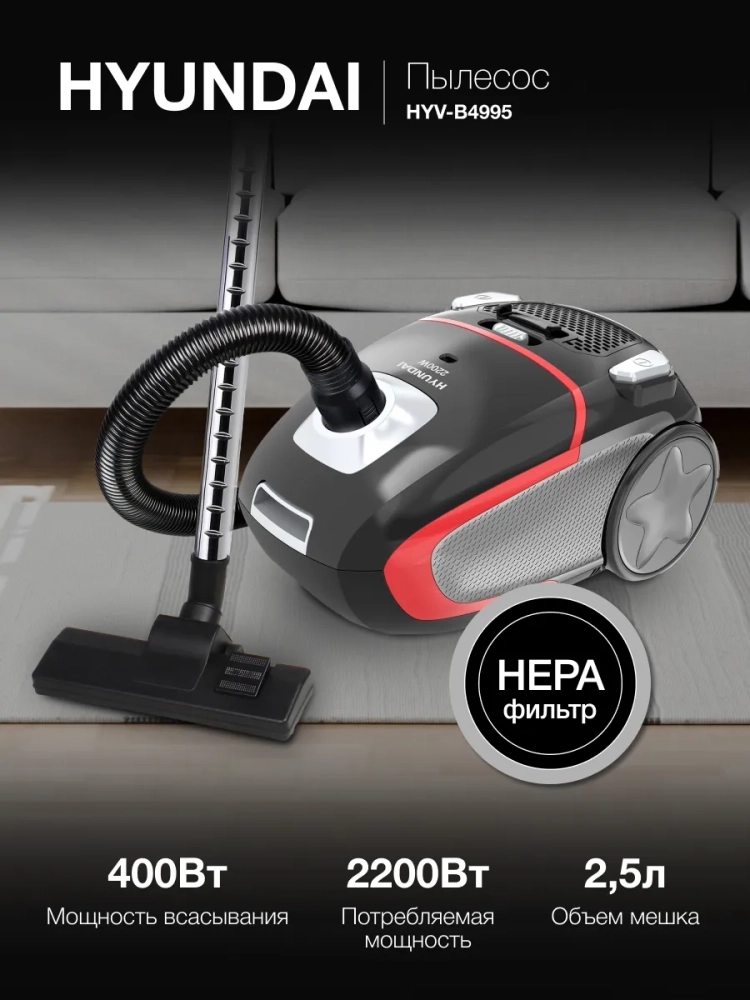 Также Hyundai HYV-B4995 оснащён фильтром тонкой очистки – HEPA. Он позволяет повысить качество воздуха после уборки.