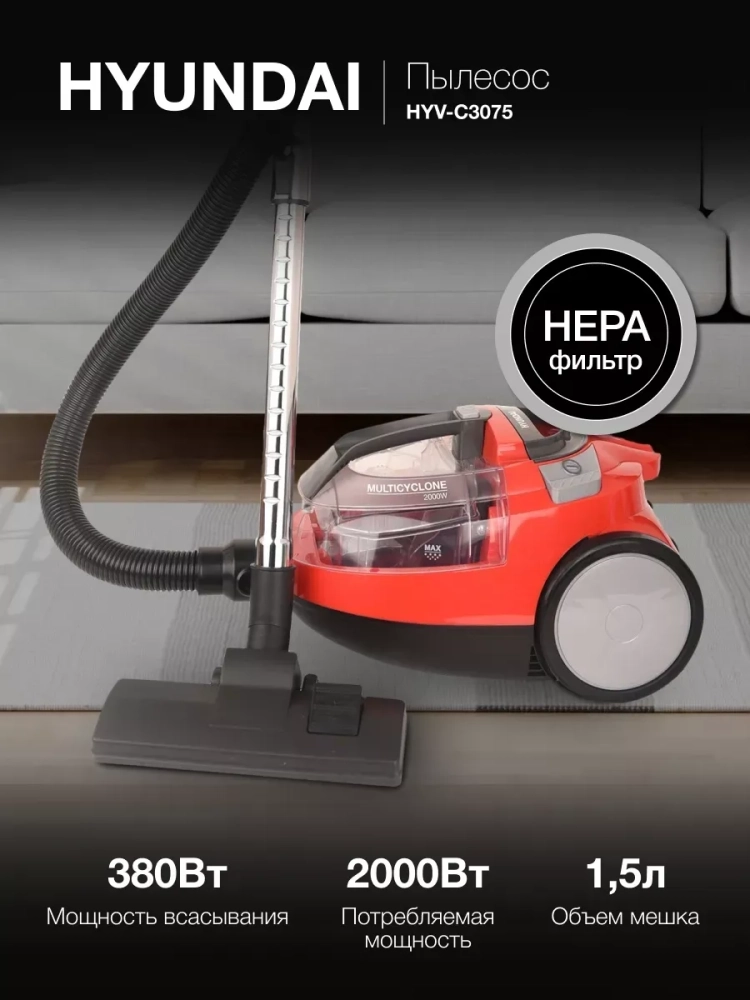 Пылесос HYV-C3075 1,5л 2000Вт красный