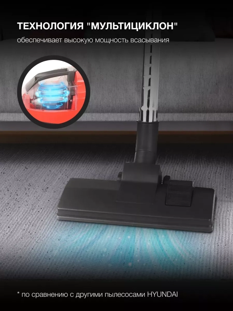 Прибор работает с использованием технологии мультициклона, которая способствует эффективной уборке и быстрому избавлению от грязи и пыли. Данная модель использует 2000 Вт в качестве общей мощности и 380 Вт для всасывания. Этот параметр легко варьируется поворотом регулятора, установленного на лёгкий пластиковый корпус устройства. Однако в любом режиме Hyundai HYV-C3075 не издаёт слишком много шума – звук держится в районе до 88 дБ.