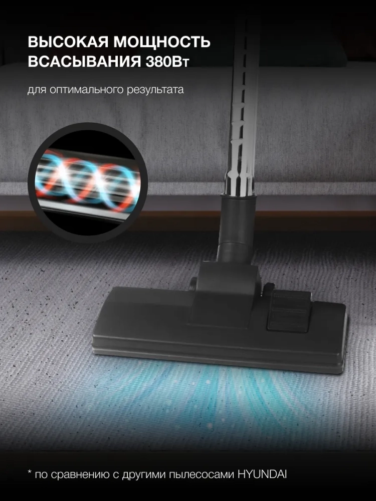 Телескопическая трубка делает процесс взаимодействия с устройством комфортнее, ведь она легко подстраивается под рост и другие условия. Для неё на Hyundai HYV-C3370 предусмотрено эргономичное крепление.