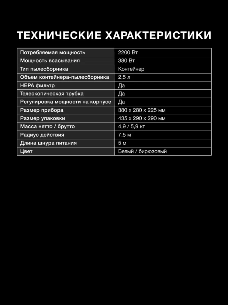• Большой пылесборник: Объем 2,5 л уменьшает частоту очистки.