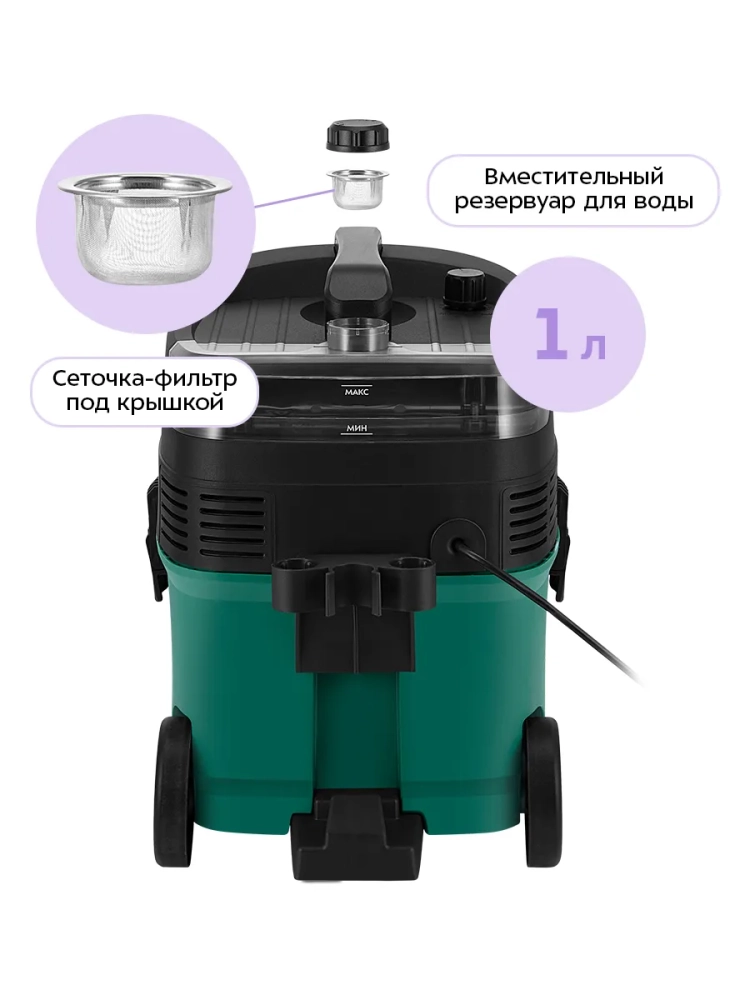 За счет нагревательного элемента и резервуара для воды емкостью 1 л пылесос может использоваться для подачи пара. Подачу пара можно включить одновременно с всасыванием мусора или отдельно. Пар ускоряет уборку и позволяет удалить въевшиеся загрязнения, а также дезинфицирует очищаемую поверхность. Время непрерывной подачи пара составляет от 20 до 30 минут в зависимости от его интенсивности.