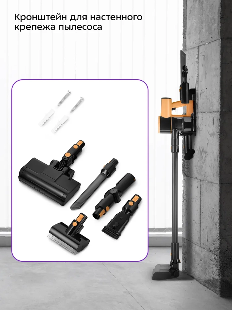 Одно из главных достоинств вертикального пылесоса — его компактность. Пылесос и насадки можно повесить на стену с помощью кронштейна и крепежей, идущих в комплекте.