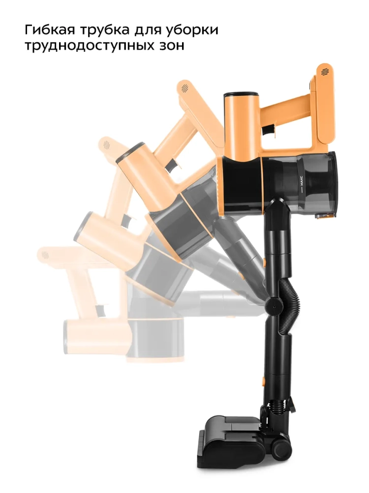 В комплекте предусмотрены узкая насадка, насадка «2 в 1», мини-турбощетка для мебели, которые можно надеть на ручной модуль пылесоса. Гибкую трубку можно подсоединить к удлинительной трубке, это позволит провести уборку в труднодоступных местах, например под диванами и шкафами.