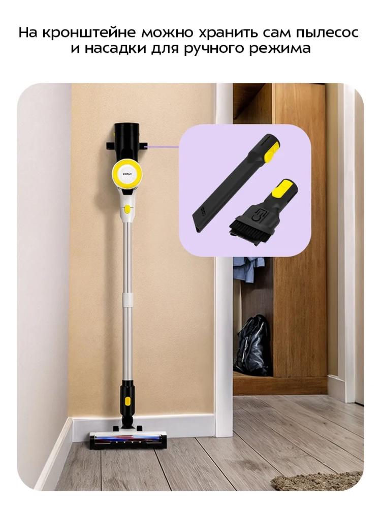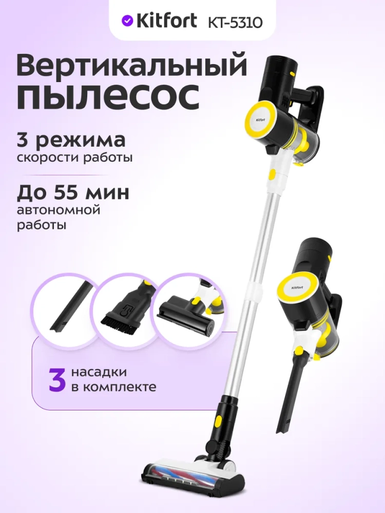 Беспроводной вертикальный пылесос Kitfort КТ-5310 очень удобен при локальной уборке. Он компактен, всегда под рукой и готов к работе. При отсоединении удлинительной трубки и установке насадки он превращается в ручной пылесос. Его конструкция позволяет легко проникать в самые труднодоступные уголки квартиры. При этом не нужно передвигать громоздкий корпус проводного пылесоса и управляться с непослушным шлангом. Благодаря работе от аккумулятора не нужно включать вилку в розетку, провода не будут мешать под ногами. Поэтому пылесос имеет неограниченный радиус действия: от любого уголка квартиры до машины или беседки в саду. Пылесос оснащен маневренной турбощеткой, которая вращается в двух плоскостях. У турбощетки есть подсветка.