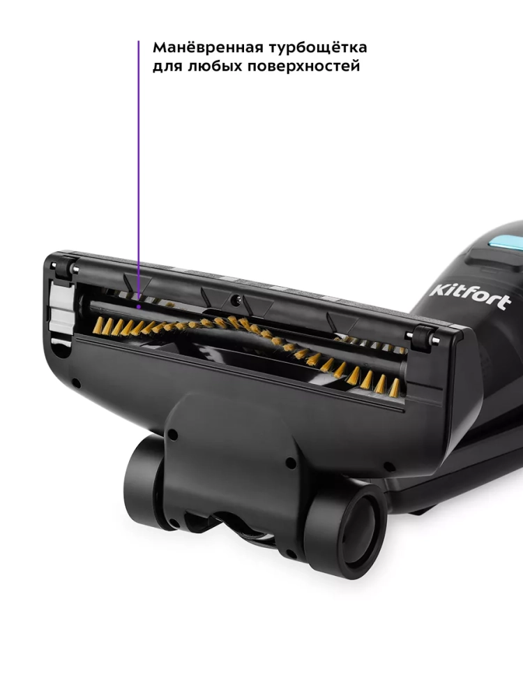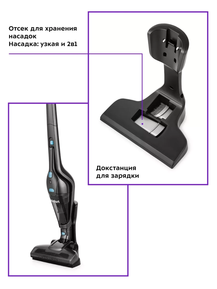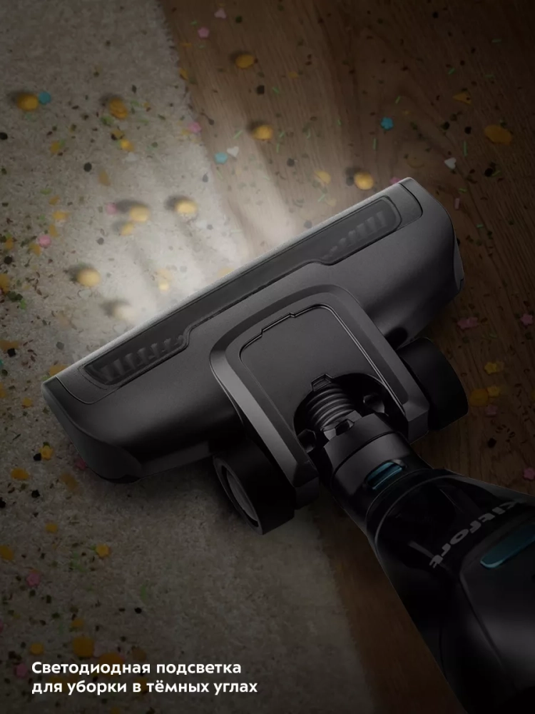 Этот вертикальный пылесос идеально подходит для сухой уборки и оснащен турбощеткой, которая эффективно очищает как гладкие поверхности, так и ковровые покрытия с коротким ворсом. Светодиодная подсветка на напольной щетке позволяет более тщательно убирать пыль и мелкий мусор. В комплекте также идет насадка «2 в 1» для труднодоступных мест и кронштейн для настенного хранения, что делает его использование еще более удобным.
