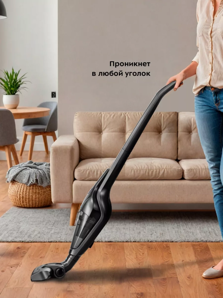 Беспроводной дизайн пылесоса позволяет свободно перемещаться по дому без необходимости подключения к розетке, что особенно удобно для быстрой уборки рассыпанного сахара или песка от обуви. Ручной пылесос, входящий в комплект, отлично справляется с уборкой мебели, плинтусов и даже салона автомобиля, что делает его универсальным помощником в доме.