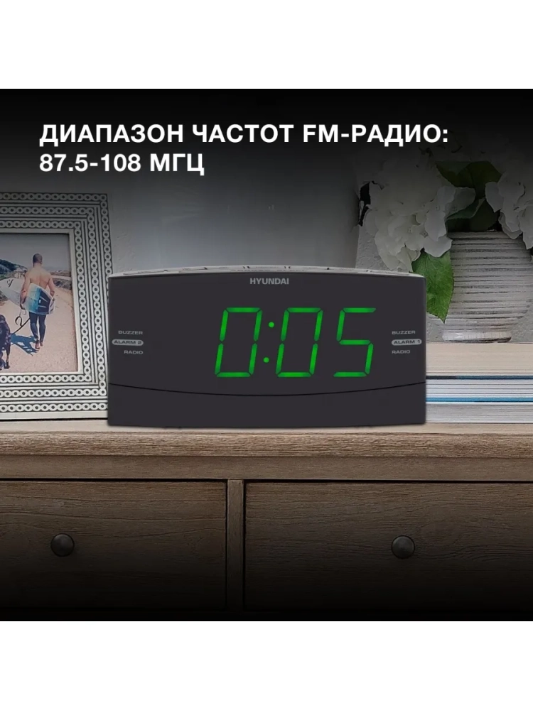 Радиобудильник Hyundai H-RCL238 черный, зеленая подсветка часов, цифровой FM тюнер.