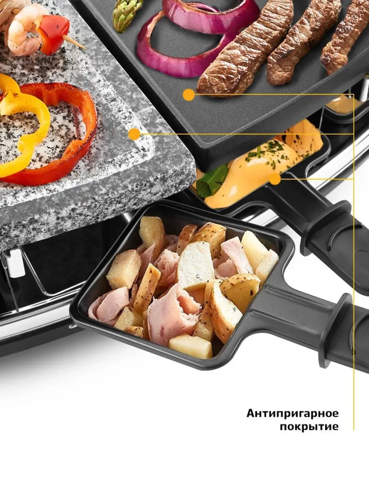 Современная раклетница Китфорт КТ-1649 имеет два яруса. На нижнем ярусе готовят сыр в порционных сковородках, верхний ярус представляет собой комбинированную жаровню, на которой можно приготовить мясо, креветки, колбаски-гриль, овощи и многое другое. На каменной плите лучше жарить мясо, а панель с антипригарным покрытием прекрасно подойдет для овощей и блинчиков.
