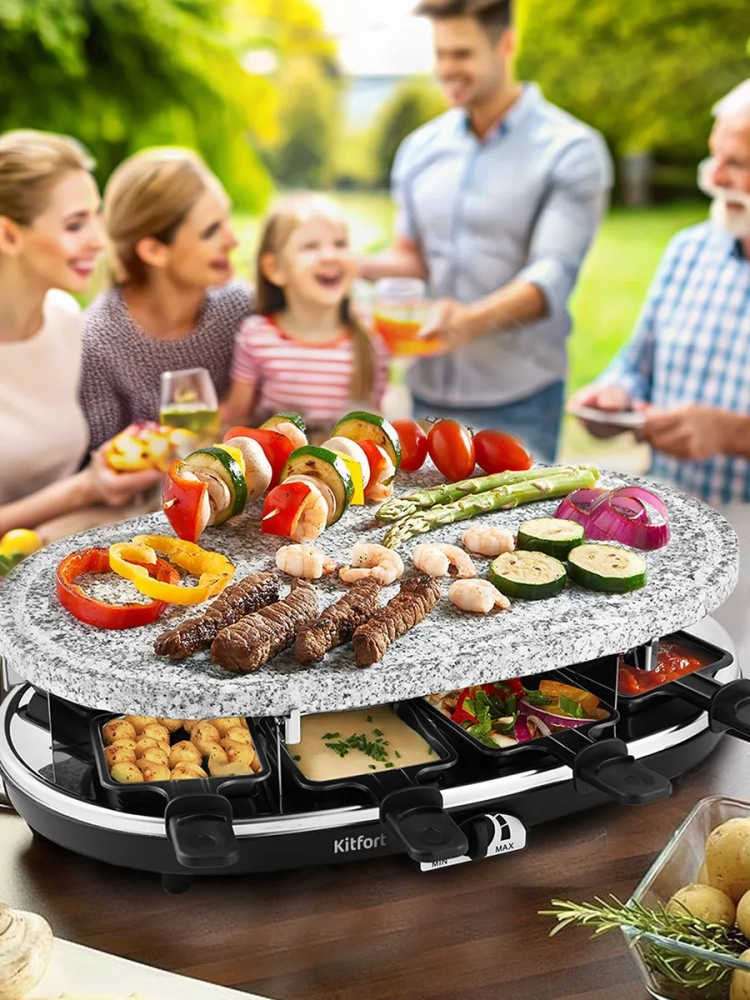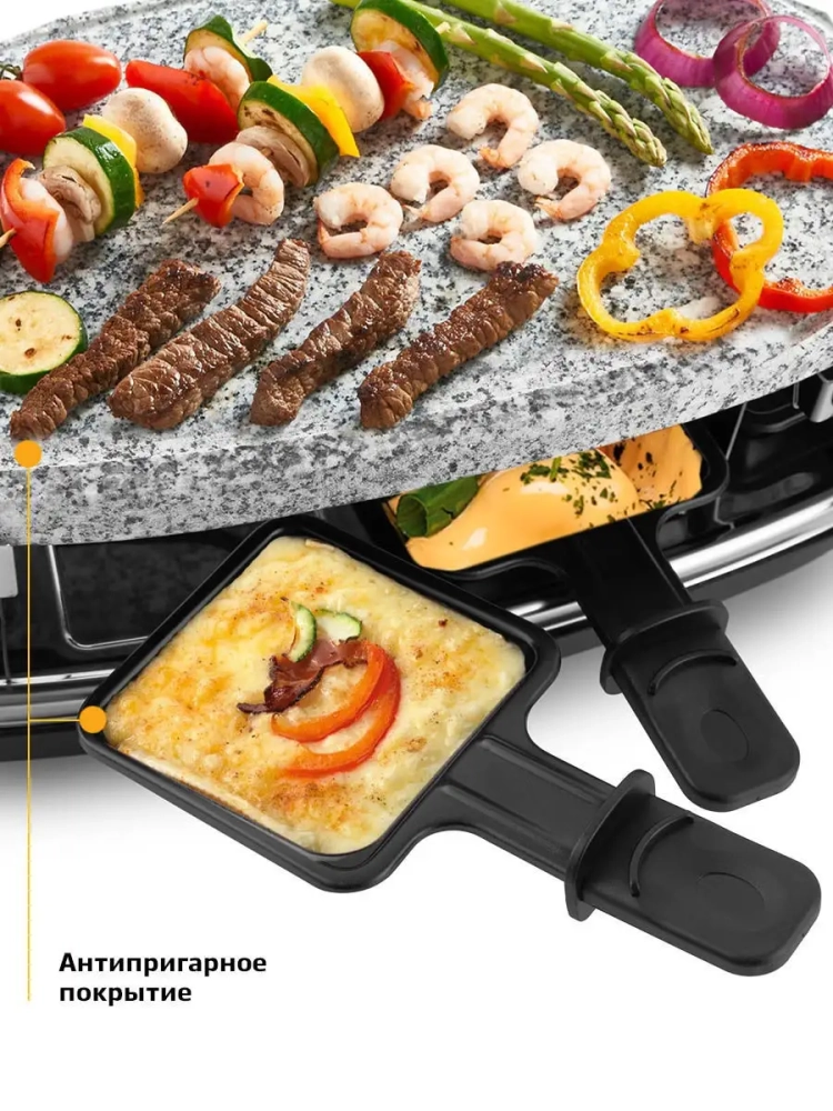 Электрическая раклетница-гриль — это бытовая техника, которая станет незаменимой частью вашей кухни. Она позволяет готовить вкусные и разнообразные блюда, экономя ваше время и усилия. Сковородка с антипригарным покрытием и мощный электрический нагрев обеспечивают идеальные условия для готовки.