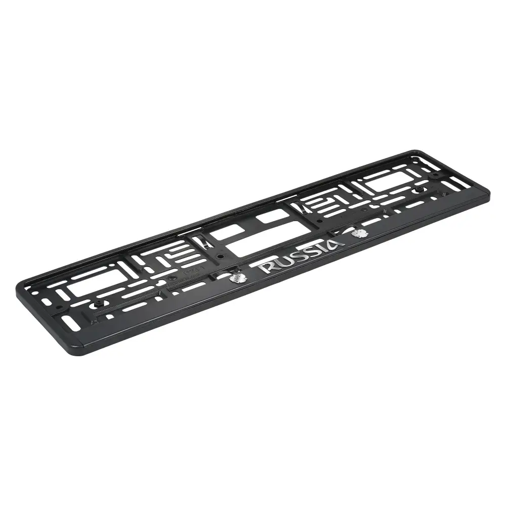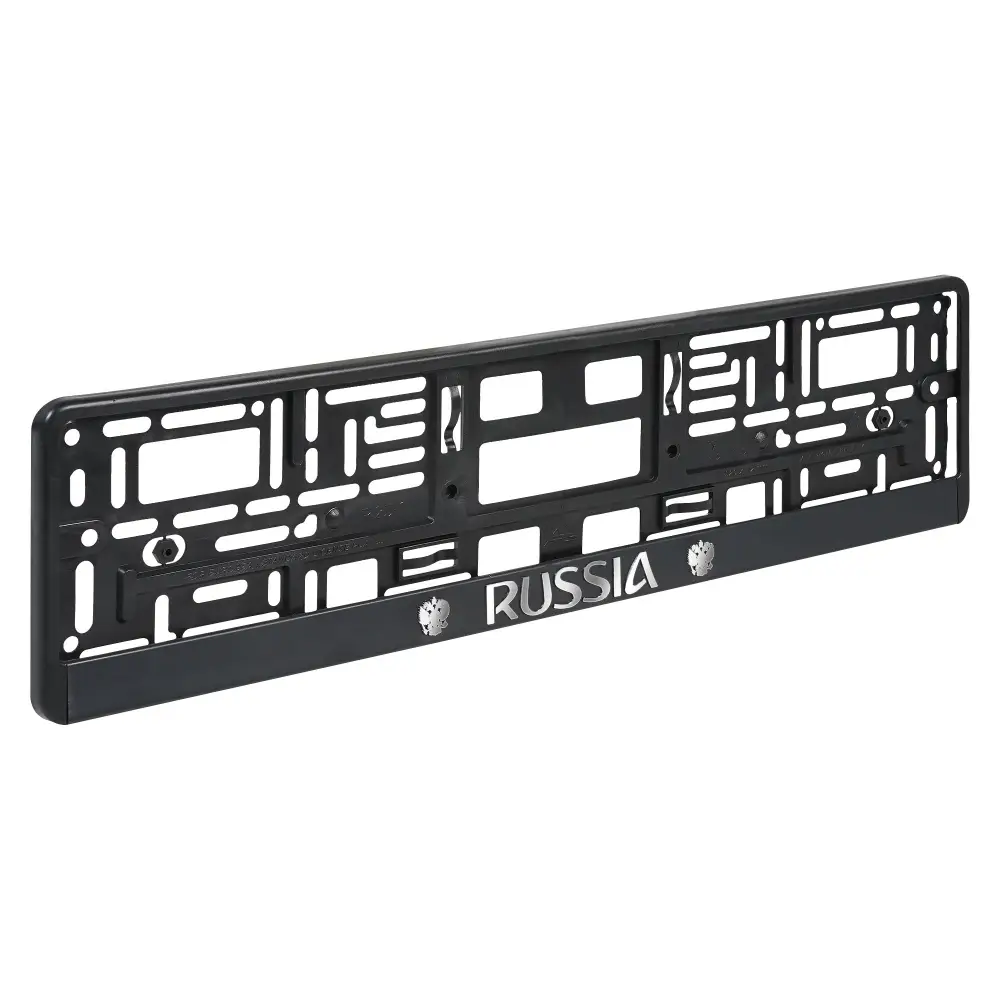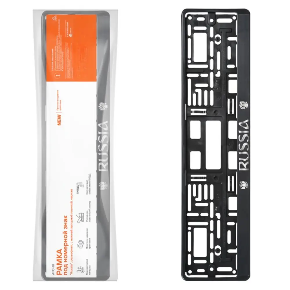 Рамка изготовлена из морозостойкого пластика и устойчива к перепадам температур. Установка рамки не займет много времени, т.к. изделие имеет простой механизм крепления, представляющий собой нижнюю планку с боковыми защелками. Данная модель рамки украшена рельефной надписью «Russia» и гербом России на нижней части изделия.
