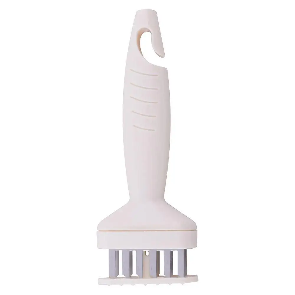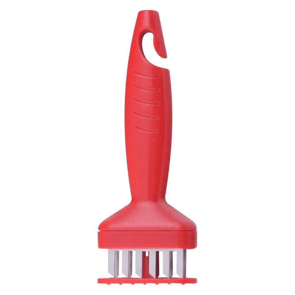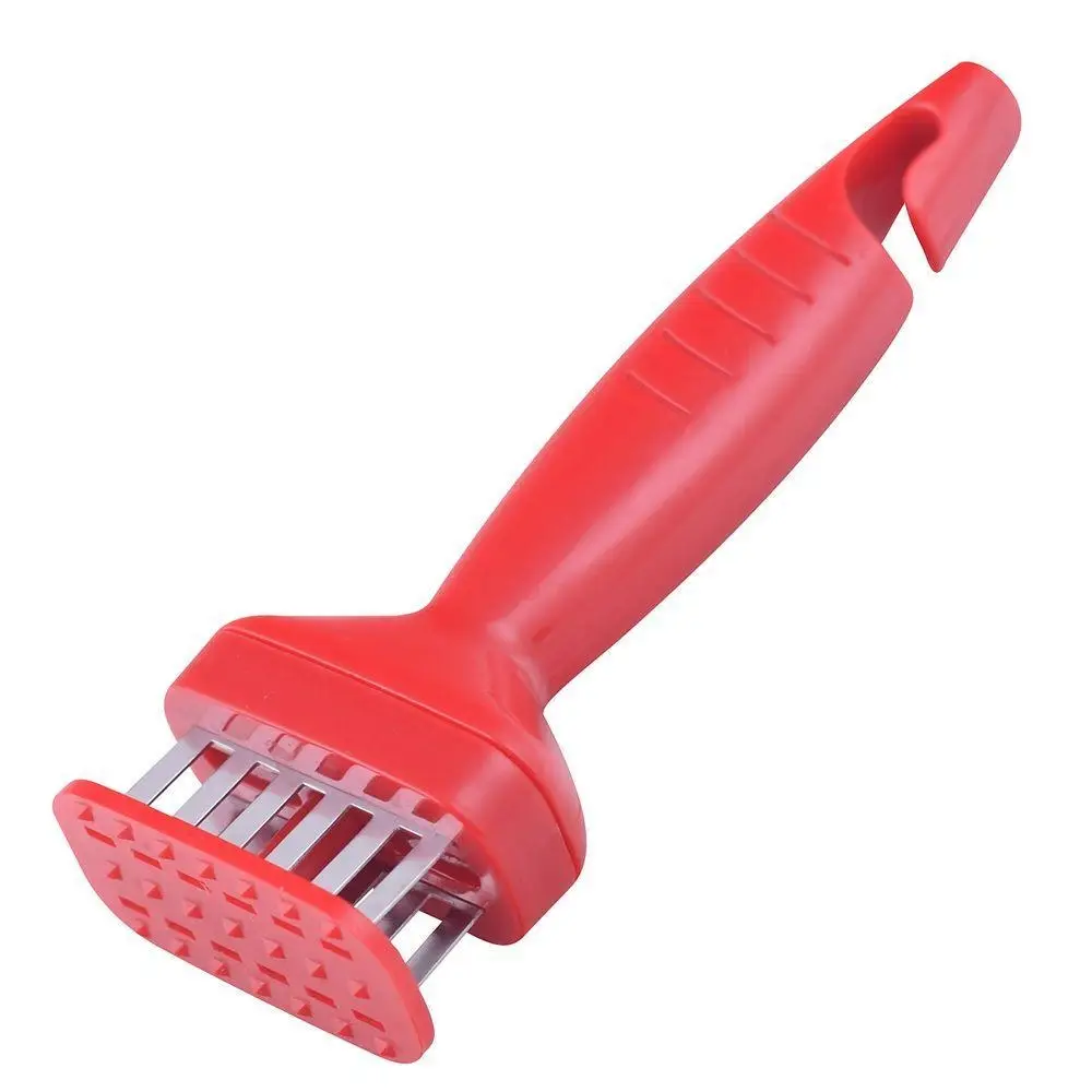 Для отбивания мяса перед приготовлением используйте размягчитель для мяса. Благодаря особой конструкции инструмент эффективно размягчает мясо, делая его сочным и нежным. Рабочая часть представляет собой стальные зубцы и пластину с зубчиками, при нажиме зубцы попадают в прорези и оказывают максимум воздействия на продукт. Изготовлено: рабочая часть из коррозионностойкой (нержавеющей) стали,корпус из ударопрочного пластика (АВС).