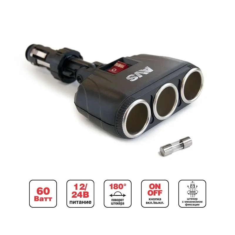 Разветвитель позволяет подключать до 3-х устройств одновременно в разъем прикуривателя через 3 собственных разъема прикуривателя. Уникальный штекер с механизмом фиксации. Кнопка включения и выключения питания. Крепкое надежное устройство в корпусе из огнестойкого пластика. Защита от короткого замыкания и перепадов напряжения. Работа в сетях с номинальным напряжение 12В и 24В. Универсален для любых автомобилей.