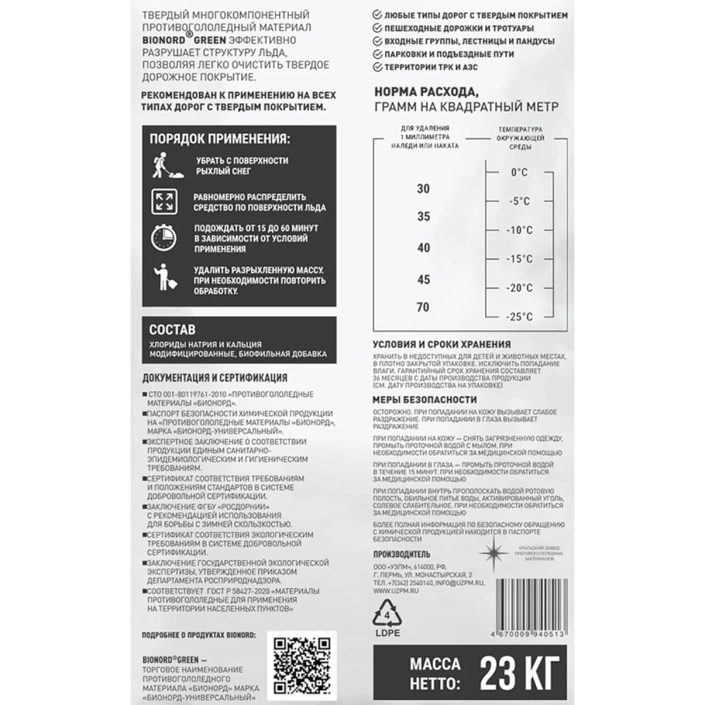 Реагент противогололёдный Bionord Green мешок 23 кг до -25С