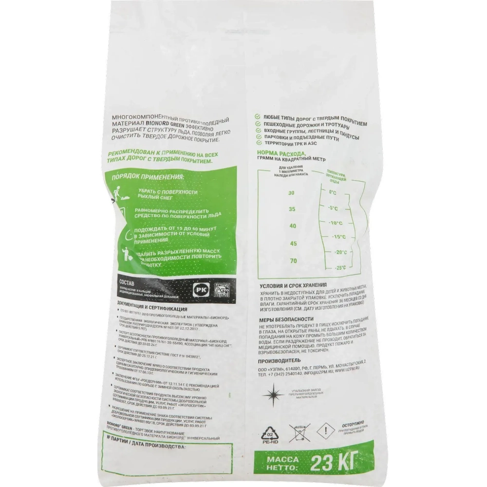 Реагент противогололёдный Bionord Green мешок 23 кг до -25С