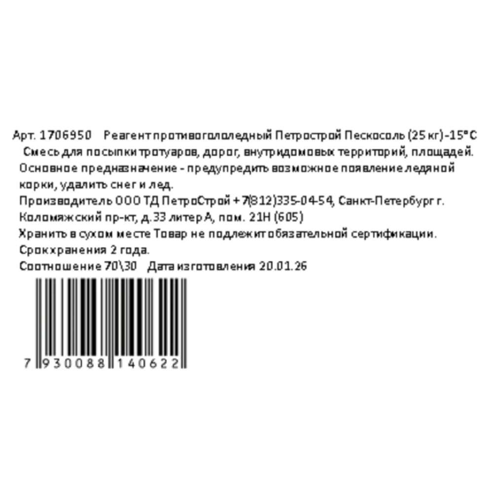 Реагент противогололёдный Петрострой пескосоль мешок 25 кг до -15С
