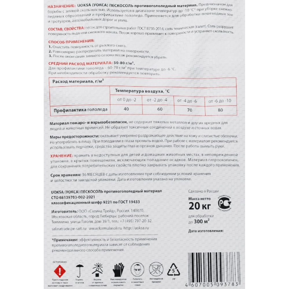 Реагент противогололёдный UOKSA Пескосоль 30% 20 кг мешок_ РТК _СПБ