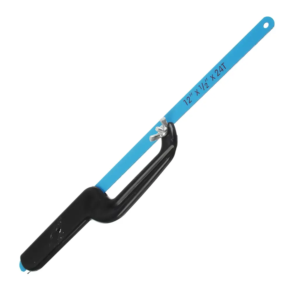 Ножовка по металлу малая Рокот предназначена для ручного распила металлических изделий и деталей небольшого размера. Комплект включает 2 предмета: полотно 310х11 мм и держатель 200 мм. Полотно изготовлено из высококачественной стали, имеет прочные и острые зубья и может быть заменено по мере износа. Форма держателя позволяет надежно зафиксировать инструмент в руке для комфортной и безопасной работы.