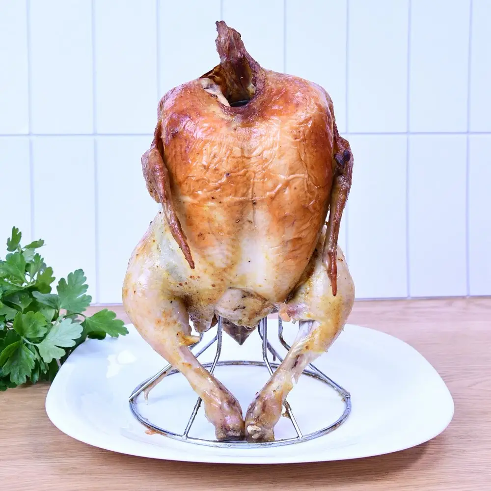Готовьте любимые блюда, используя удобное приспособление – ростер для жарки кур в духовке. Такая подставка позволит равномерно запечь мясо птицы, чтобы оно получилось сочным и вкусным. Установите изделие на противень или специально подготовленную форму, закрепите тушку на металлический каркас и поместите в духовку. Курица гриль получается хрустящая со всех сторон благодаря тому, что жир во время приготовления равномерно стекает по всей тушке. Можно выложить на противень ломтики картофеля или других овощей и вкусный ужин готов. Приспособление изготовлено из стальной хромированной проволоки, которая является гигиеничным и устойчивым к высоким температурам материалом. Перед первым и после каждого применения, промыть в тёплой воде, можно с жидким моющим средством, сполоснуть проточной водой и просушить. Не рекомендуется мыть в посудомоечной машине. Высота 21 см, диаметр 19 см.