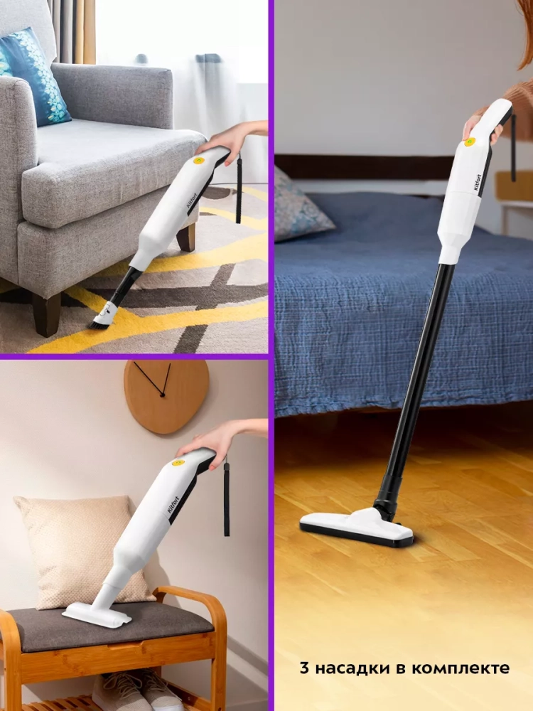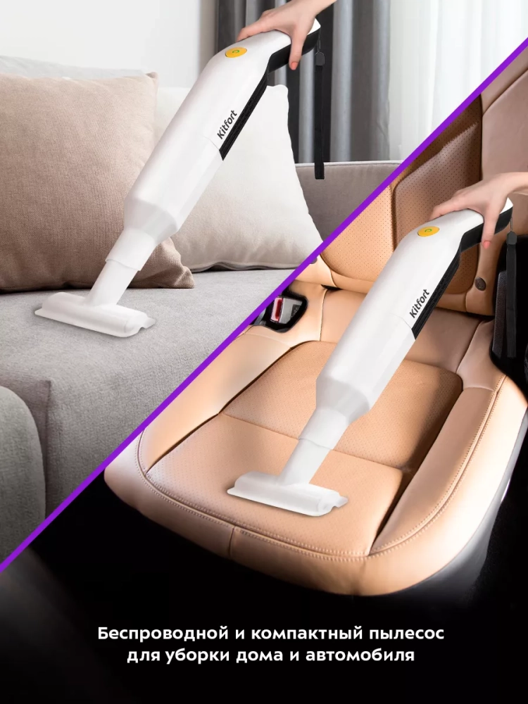 Ручной пылесос Kitfort КТ-5179 удобен при локальной и генеральной уборке. Он компактен, работает от аккумулятора, и при желании легко трансформируется в вертикальный пылесос благодаря наличию удлинительной трубки и щетки для пола в комплекте.