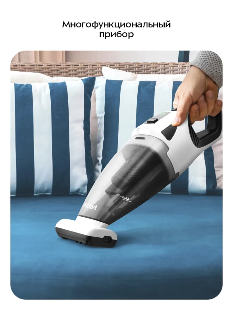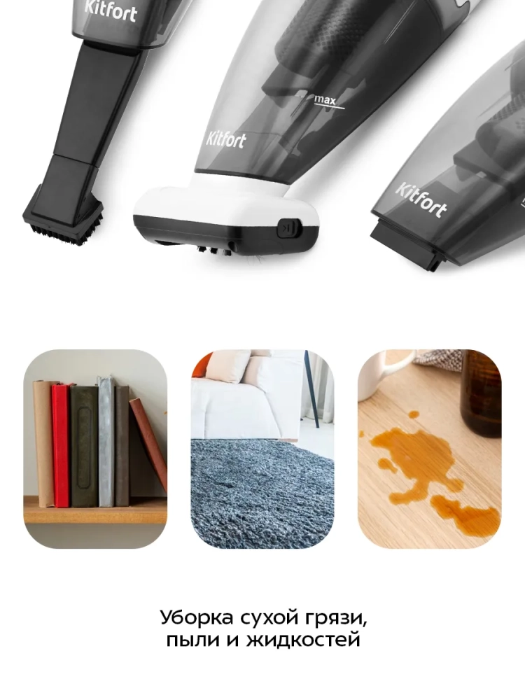 Ручной беспроводной пылесос Kitfort КТ-557 поможет вам очистить любые загрязнения в доме, салоне автомобиля и любых других местах. Он позволит вам качественно очистить мягкую мебель, чемодан или сумку, собрать пролитую жидкость или мусор из труднодоступных мест. Пылесос имеет две скорости работы. Турбощетка с высокой скоростью вращения вычистит любые ворсистые материалы от пыли, прилипшей шерсти, волос и ниток. Длинная узкая насадка со съемной ворсовой щеткой поможет вам вычистить самые труднодоступные места, а силиконовая насадка отлично подходит для сбора жидкости. Литий-ионный аккумулятор обеспечивает высокую мощность и длительное время работы до 30 минут. КТ-557 станет вашим главным помощником в уборке. Пылесос оборудован современной трехуровневой системой фильтрации.