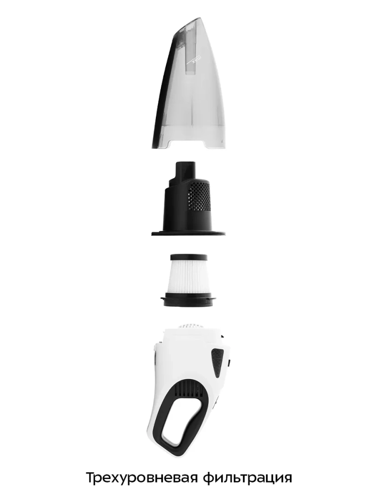 Первый уровень это циклонный фильтр, который отсеивает наиболее тяжелые или объемные загрязнения, попавшие в пылесборник. Принцип работы циклонного фильтра состоит в закрученном воздушном потоке, при котором мусор в нижней части пылесборника двигается по кругу и не блокирует фильтры тонкой и грубой очистки. Ведь если в пылесборник попадет лист от растения и прилипнет затягиваемый потоком воздуха к фильтру грубой очистки, то общий поток воздуха значительно снизится.