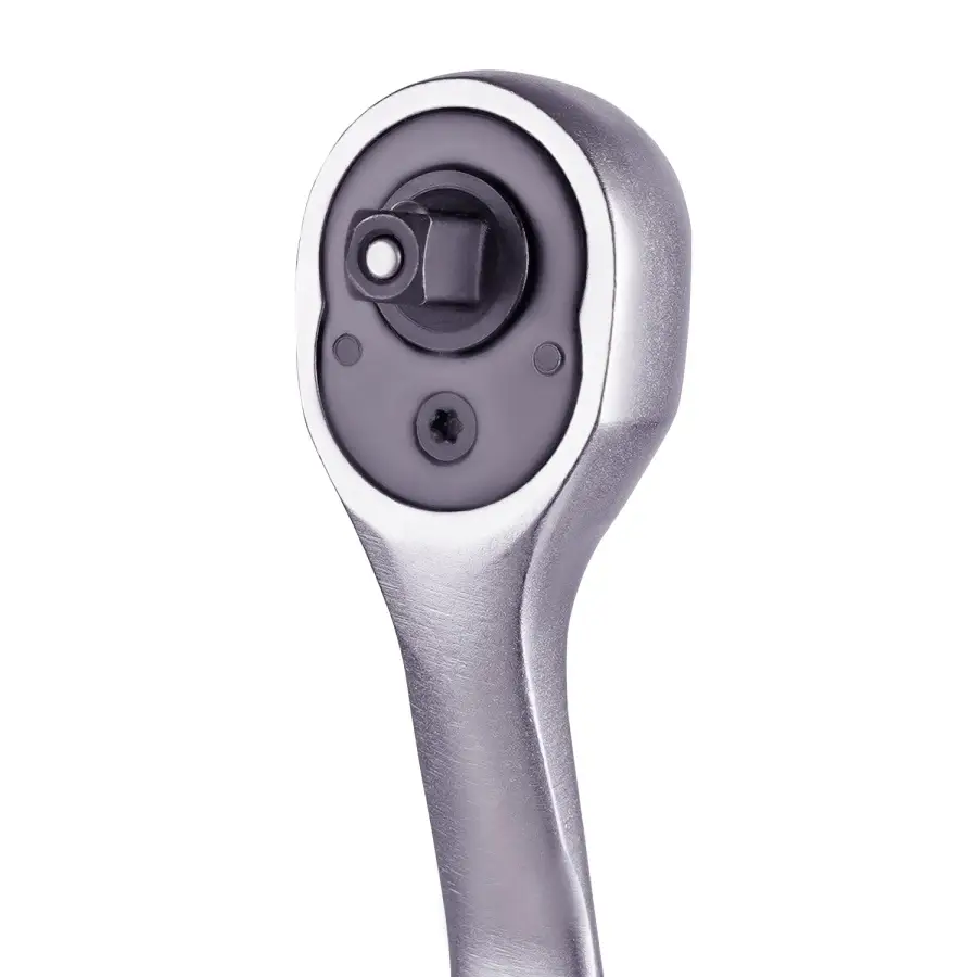 Трещоточная рукоятка с 72-зубцовым храповым механизмом обеспечивает очень маленький 5° обратный ход благодаря конструкции храпового механизма. Изогнутая форма ручки позволяет использовать изделие при обслуживании заглубленного крепежа без опаски повреждения руки. Двухкомпонентная резинопластиковая рукоятка обеспечивает надежное удержание инструмента.