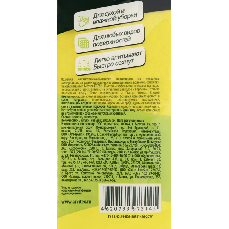 Салфетка хозяйственная Master FRESH ЭКОНОМ вискоза 3 шт/уп