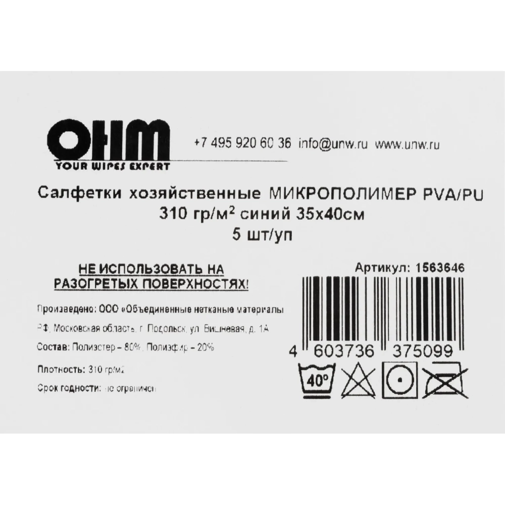 Салфетка хозяйственная микрополимер PVA/PU 35х40 310 г/м2 синий 5 шт/уп