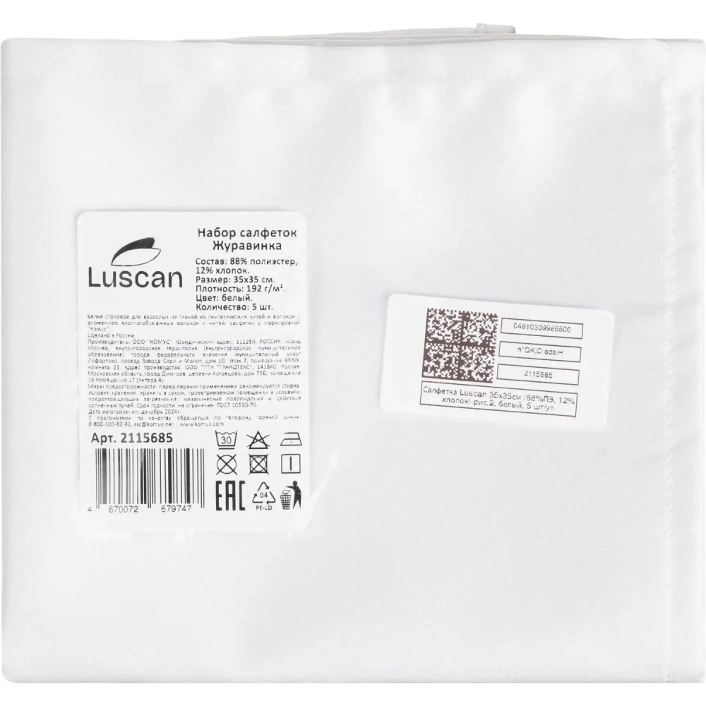 Салфетка Luscan 35х35см (88%ПЭ, 12%хлопок) рис.2, белый, 5 шт/уп