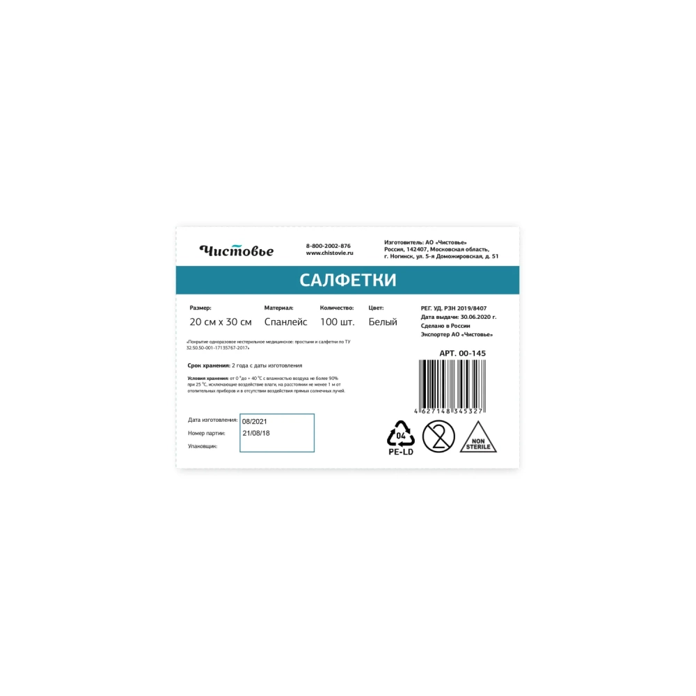 Салфетка однораз. спанлейс, 20х30, белый, 100 шт/уп Т