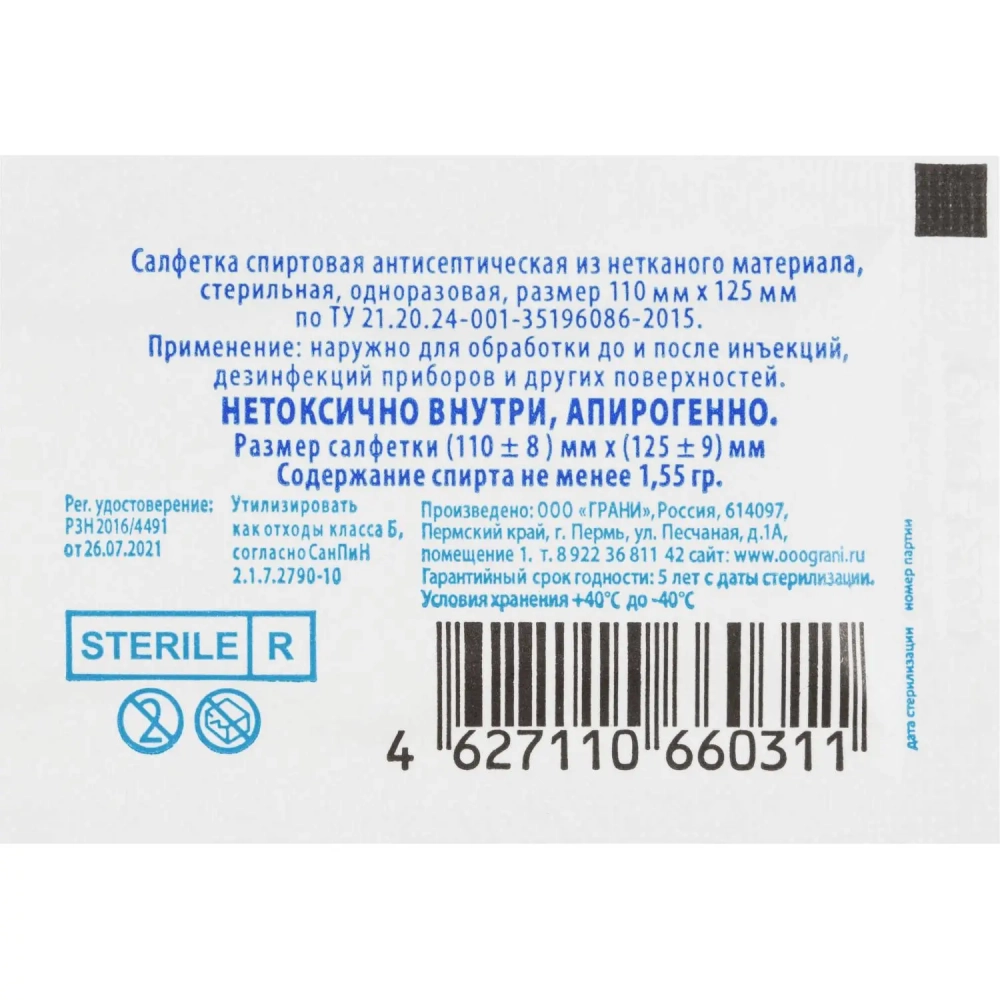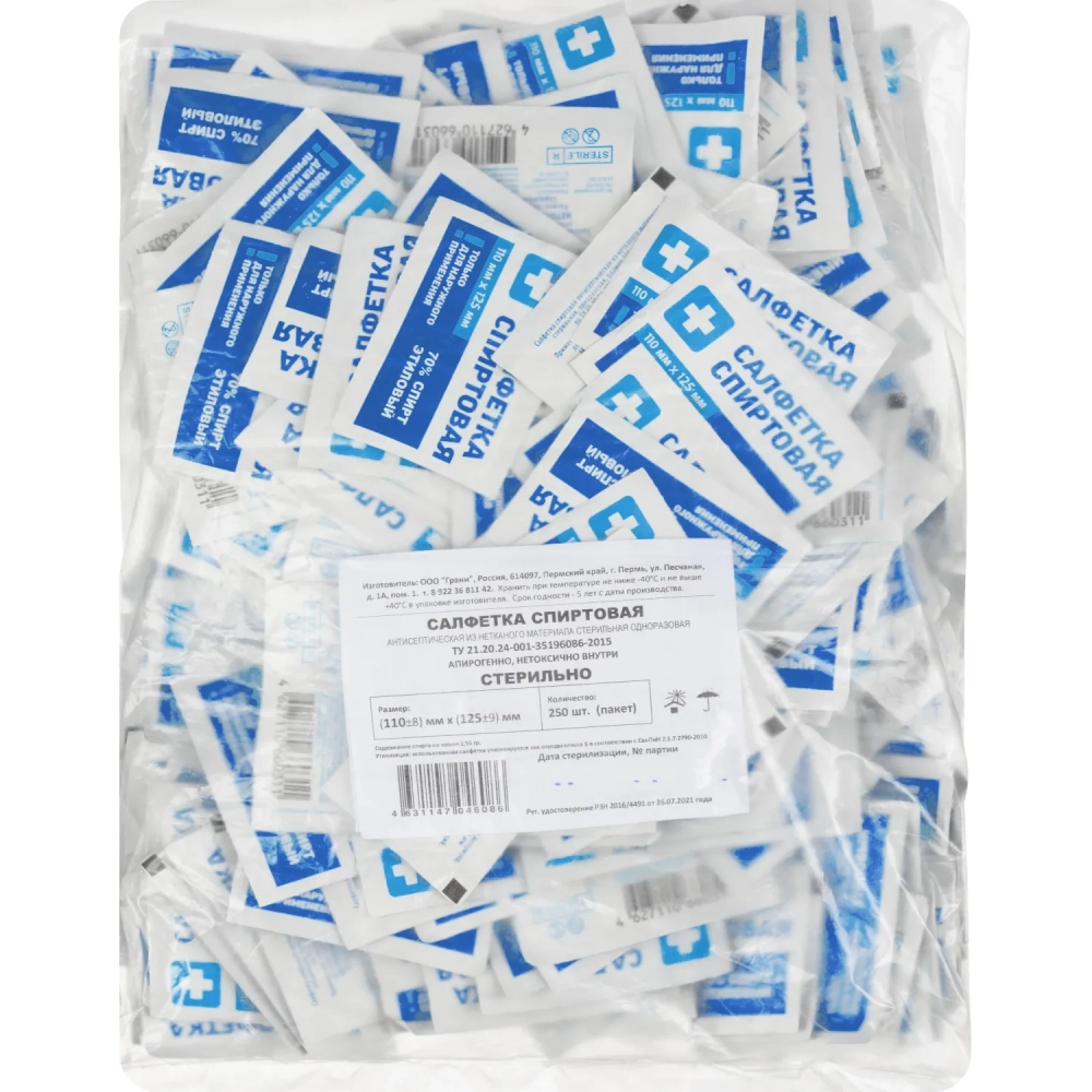 Салфетка спиртовая, антисептическая, этил. сп. 110х125мм Грани 250 шт./уп