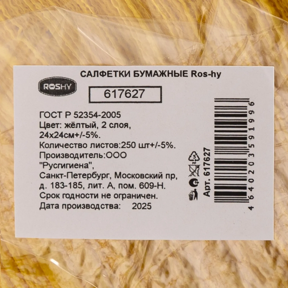 Салфетки бумажные 2 сл. 24х24 желтые 250 шт./уп