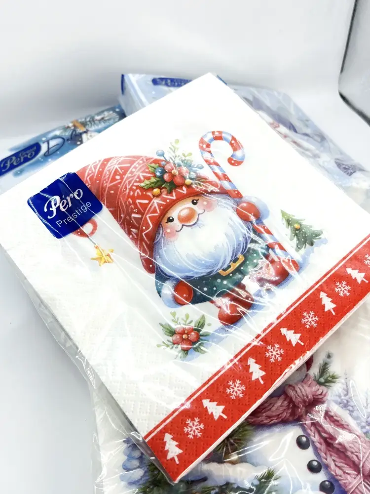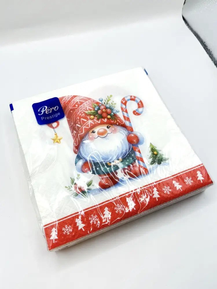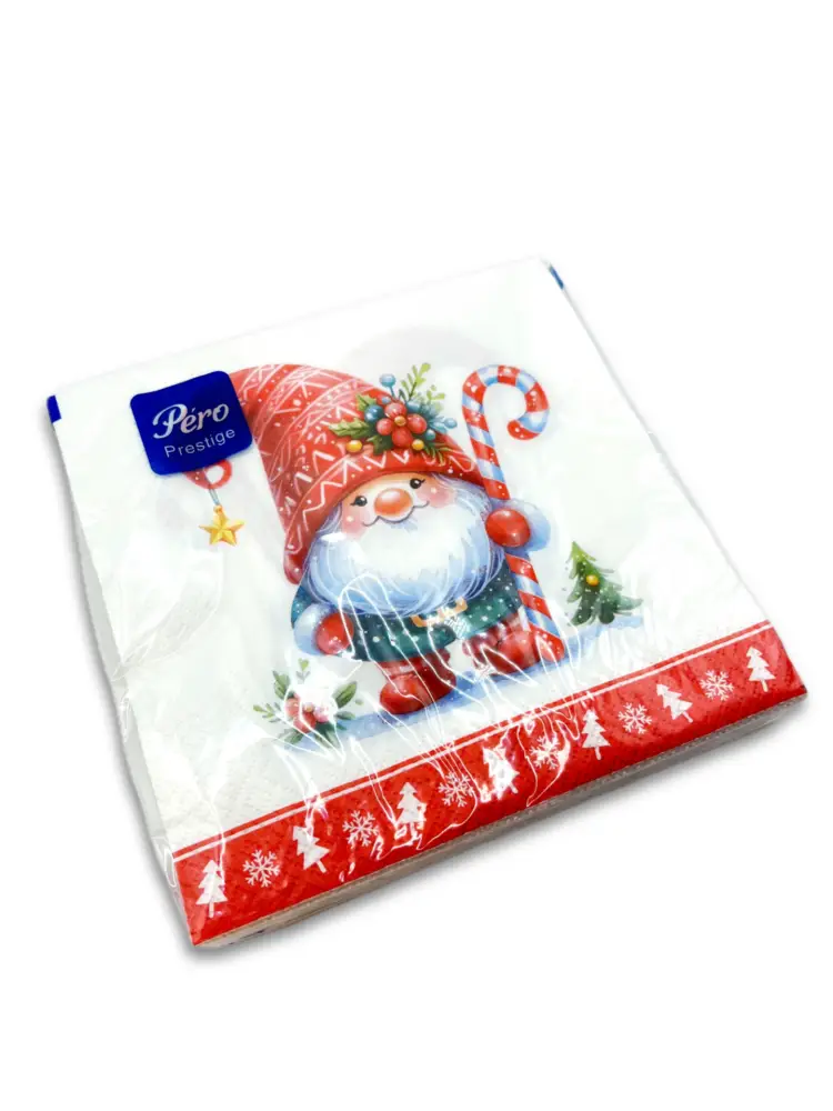 Салфетки бумажные новогодние Pero Prestige "Домовенок". Трехслойные. В 1 паковке – 20 штук.