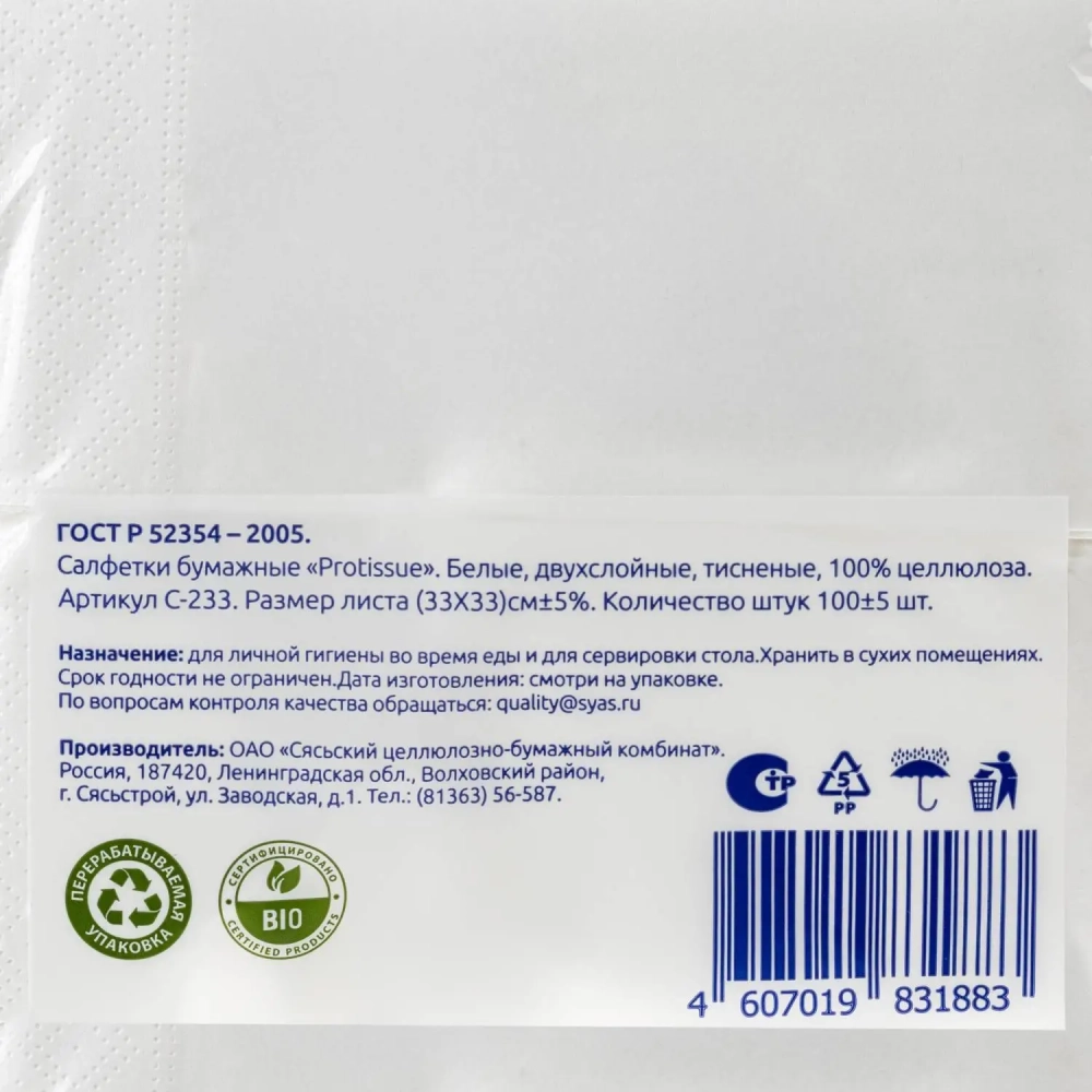 Салфетки бумажные Protissue 1/8 слож 2сл 33х33см белые 100л/уп_C233