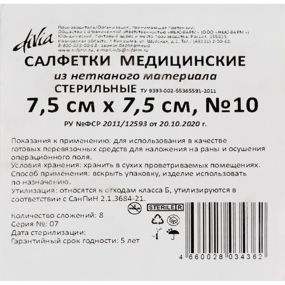Салфетки нетканые, стер, 7,5х7,5см, №10, пл.40, 8 слож., 10шт/уп ШК34362