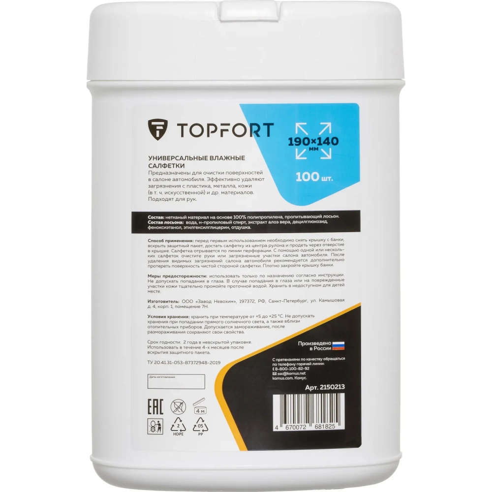 Салфетки универсальные влажные для рук и авто в тубе,100 шт(140x190мм)