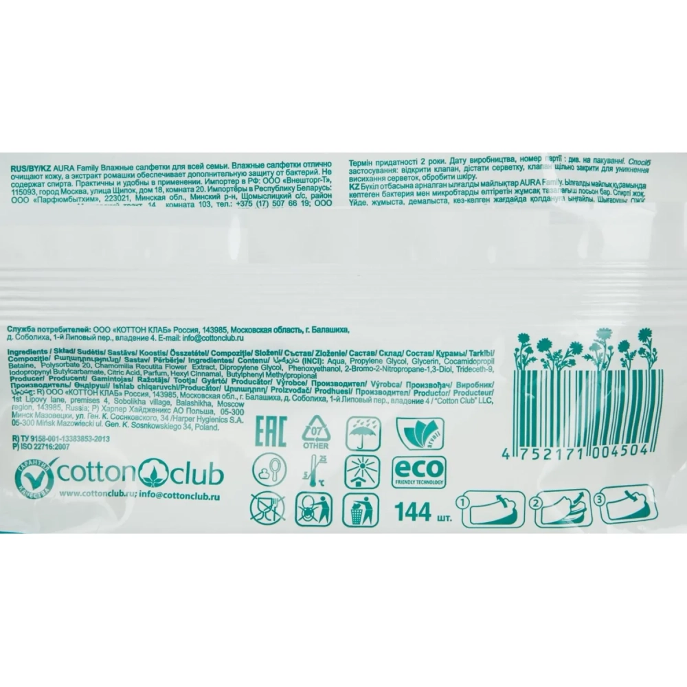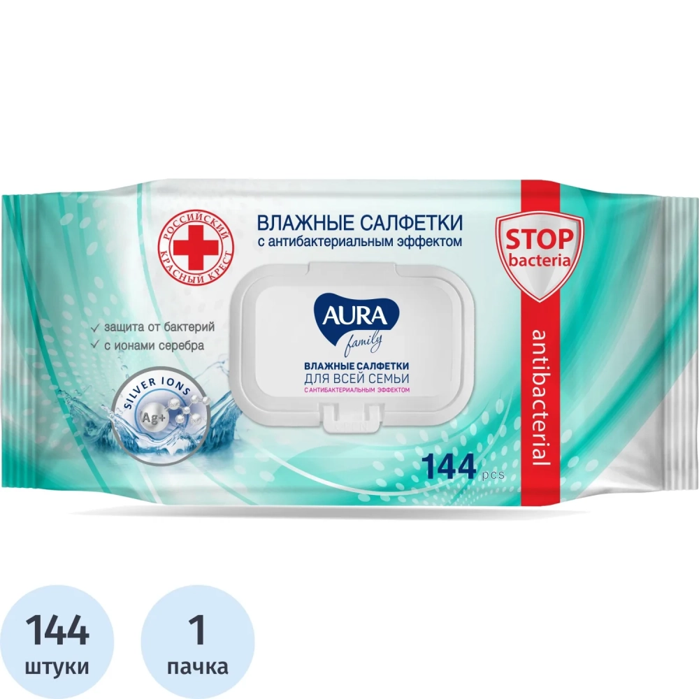 Салфетки влажные AURA FAMILY с антибактериальным эффектом с крышкой 144шт