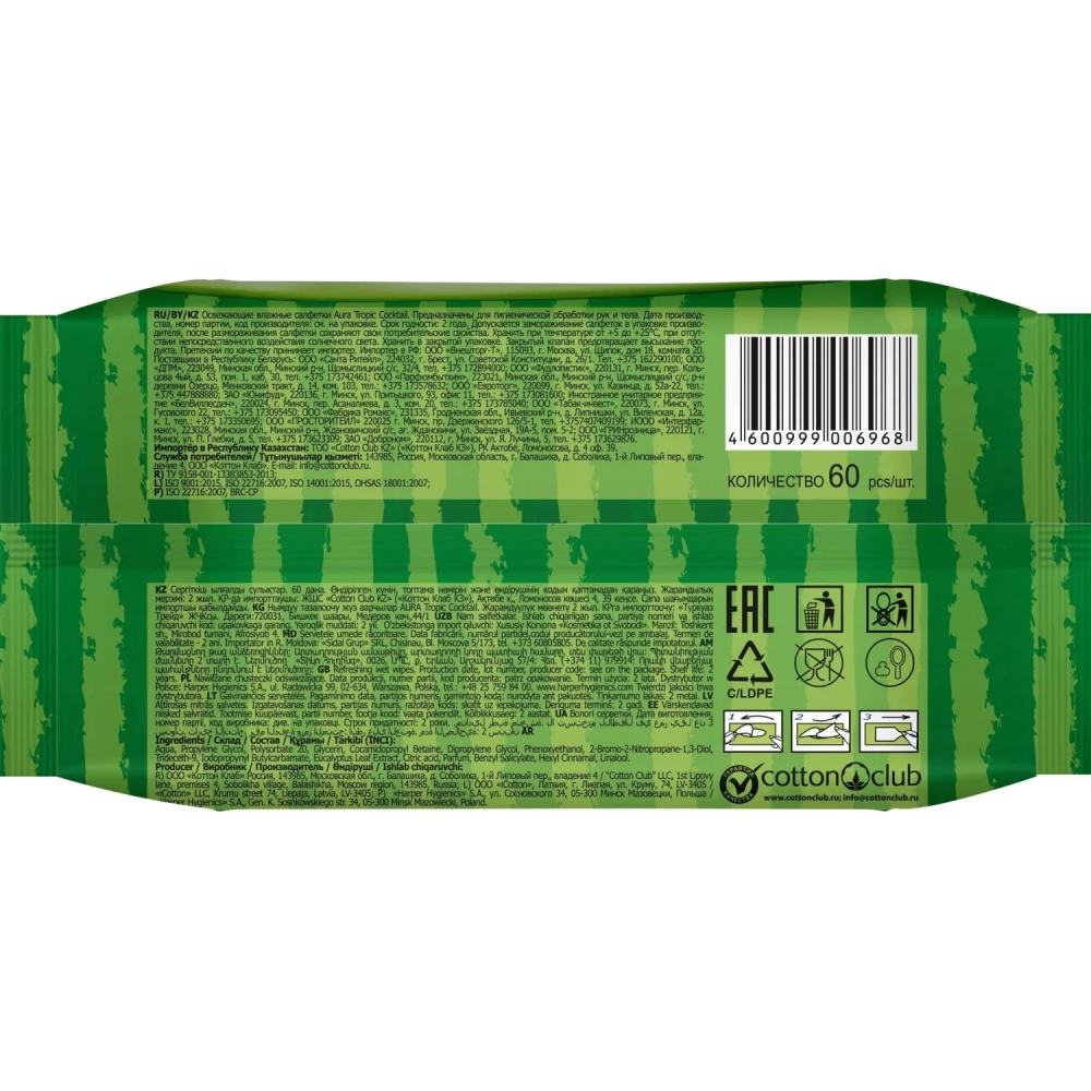 Салфетки влажные освежающие AURA TROPIC COCKTAIL в ассортименте 60шт