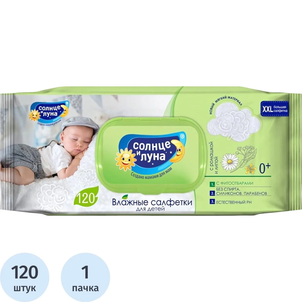Салфетки влажные СОЛНЦЕ И ЛУНА детские 0+ с ромашкой и липой с крышк 120шт
