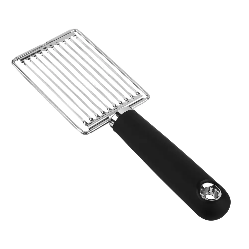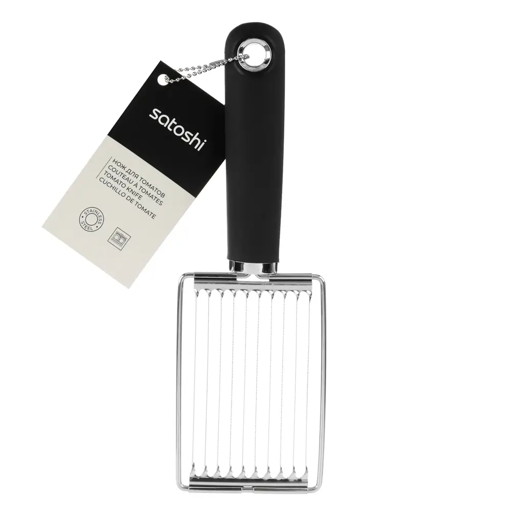 Нож для томатов SATOSHI Лоран - незаменимый помощник на кухне, предназначенный для аккуратной и быстрой нарезки помидоров и других мягких овощей и фруктов на одинаковые кусочки. Слайсер имеет острое лезвие, которое легко прорезает кожицу томата, не повреждая мякоть. Кроме того, он оснащен специальными зубчиками, которые удерживают овощ на месте во время нарезки, что делает процесс безопасным и удобным. Изготовлен из коррозионностойкой (нержавеющей) стали.