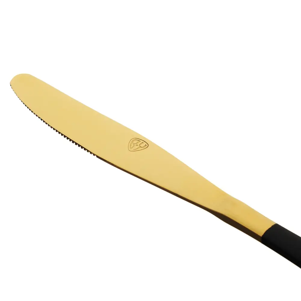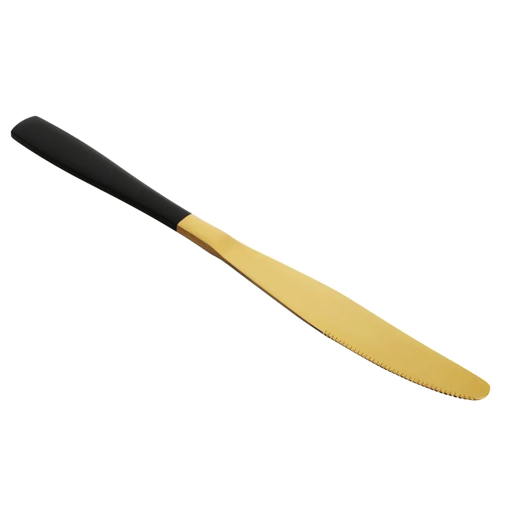 Столовый нож SATOSHI Talinka – это элегантный прибор для торжественной сервировки. Сочетание черной матовой рукояти и золотого лезвия смотрится роскошно и изысканно, превращая нож в яркий акцентный элемент сервировки. Изделие из нержавеющей стали имеет высокую прочность, устойчивость к деформации и к коррозии. Эргономичная ручка обеспечивает удобный хват, а зубчатое лезвие гарантирует легкое и аккуратное разрезание блюд и не требует заточки. Идеальный выбор для тех, кто ценит премиальный дизайн и безупречное качество. Для создания гармоничного единого стиля сервировки комплект можно дополнить другими столовыми приборами из одноименной коллекции.