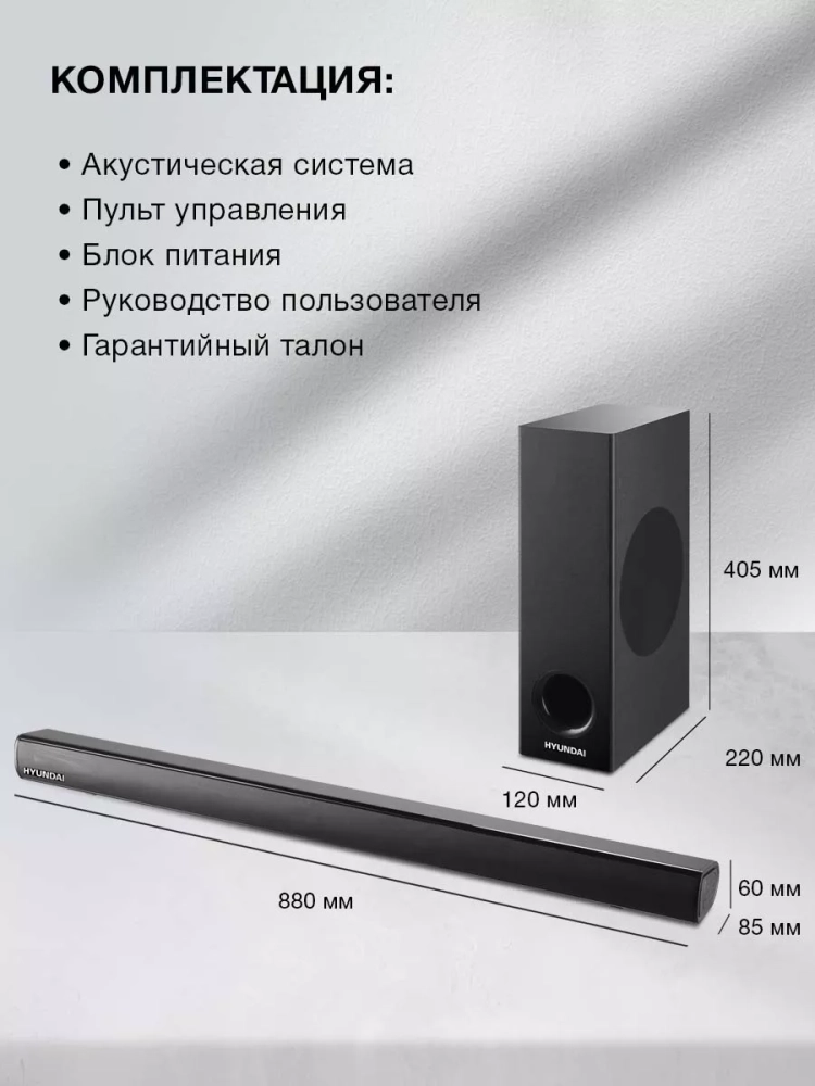 саундбар hyundai H-HA630 предназначен для качественного воспроизведения аудиоматериалов, передаваемых телевизором, мобильным телефоном, планшетом, компьютером, радиоприемником. Проводной сабвуфер наполнит басами даже самое просторное жилье, уверенно поддержит звуки, исходящие из пары динамиков. Благодаря слаженной работе саундбар для телевизора зрители и слушатели получат максимум удовольствия от просмотра сериалов и мультфильмов, прослушивания мелодий различных музыкальных направлений. Эффект усиливается за счет поддержки объемного звука.