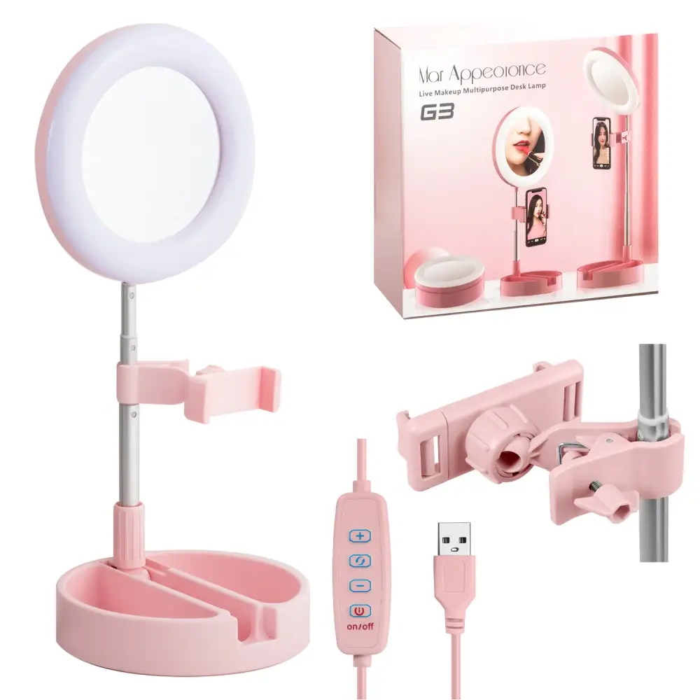 Комплектация: селфи лампа, кабель питания, зажимное крепление и держатель для телефона