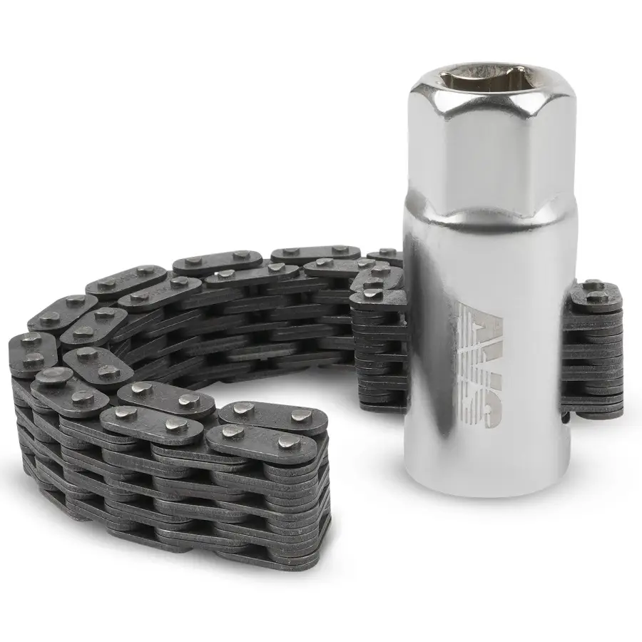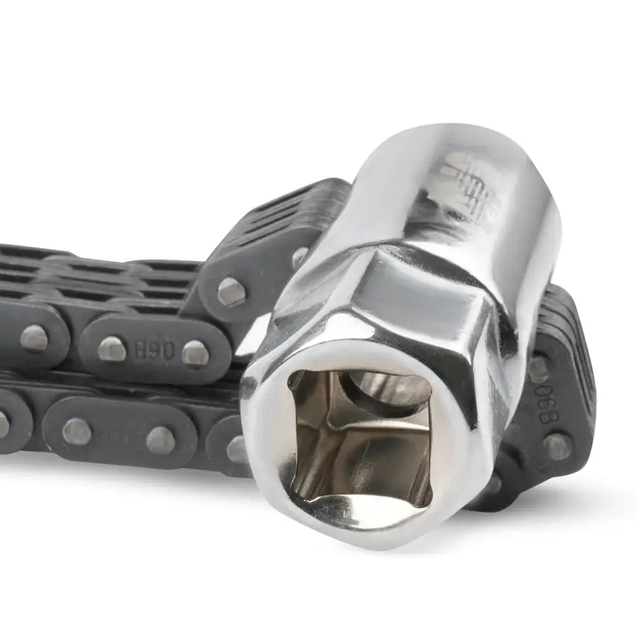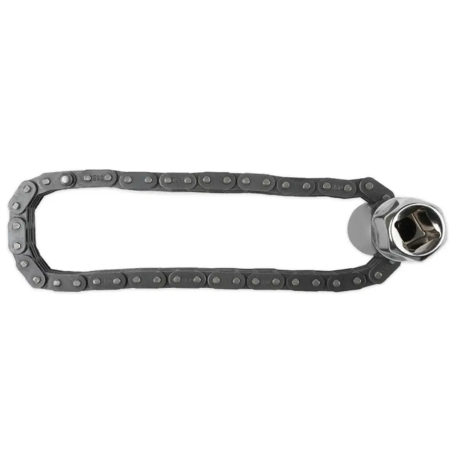 Применяется для демонтажа корпусных масляных фильтров двигателей внутреннего сгорания. В качестве захвата используется стальная двухрядная цепь. Имеет присоединительный квадрат 1/2"DR и внешний шестигранник размером 24 мм под гаечный ключ или торцевую головку.